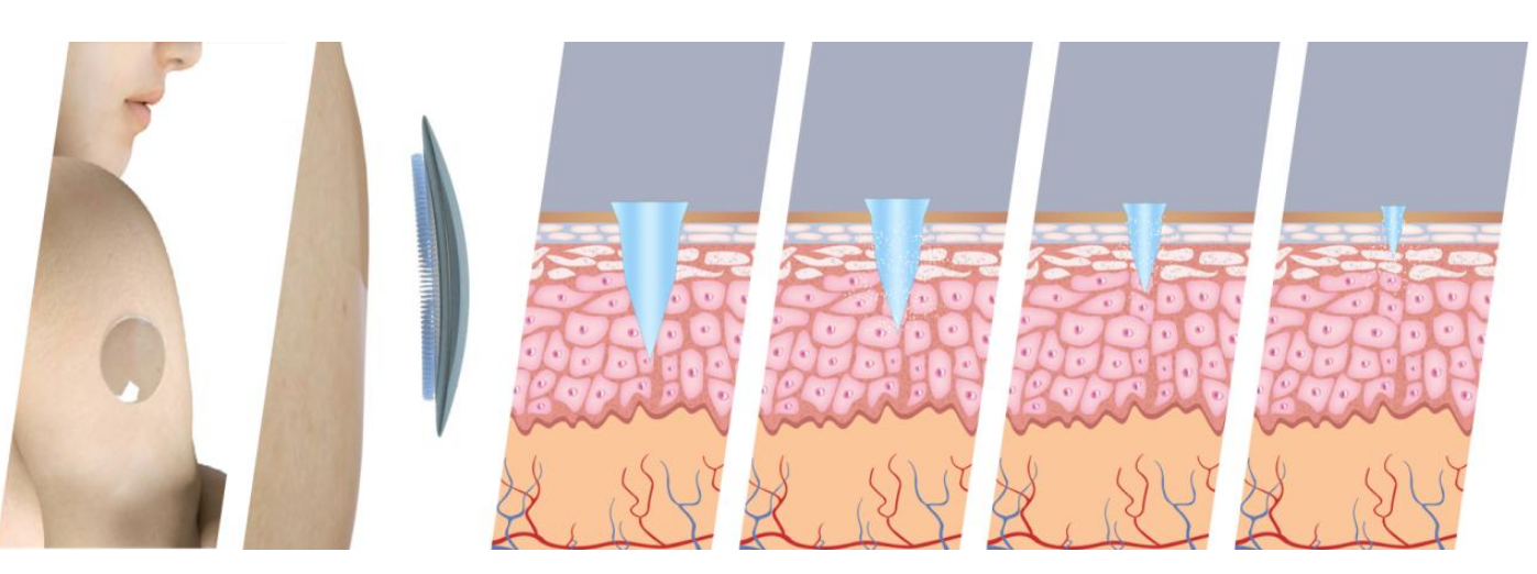 21世紀(jì)最引人注目的透皮給藥新技術(shù)——微針給藥,通過微針處理技術(shù),將有效成分合成微小針體樣貼片,直接貼敷在肌膚上進(jìn)行治療的一種新式方式。它可以恰好穿過角質(zhì)層而不觸及痛覺神經(jīng),在起到促滲作用的同時(shí)又不引起痛感和皮膚損傷,是在皮膚角質(zhì)層上打開垂直、可見的通道。他在臨床上有極廣泛的用途,適用于胰島素、干擾素、抗體等生物藥品及疫苗等藥品的給藥。