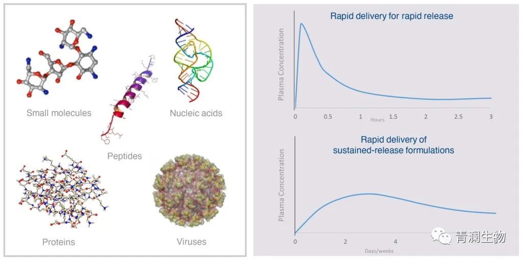 微針溶解在皮膚中以快速遞送 API,其可以在幾分鐘或幾小時(shí)內(nèi)釋放,或者在幾天或幾周內(nèi)釋放,具體取決于配方。該技術(shù)可提供高達(dá) 10 毫克的 API,可應(yīng)用于小分子、核酸、多肽、蛋白質(zhì)和治療性病毒。此外,微針具有耐熱性,無需冷藏。